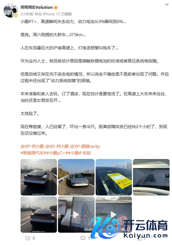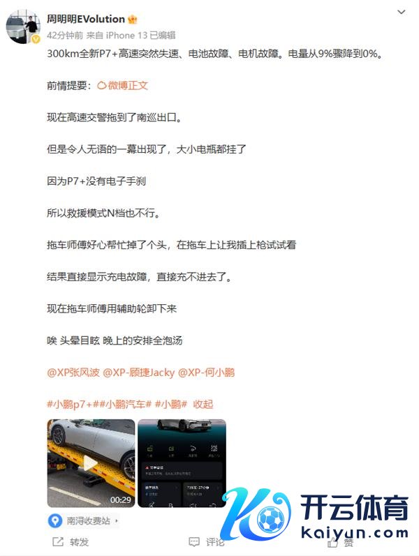 快科技 1 月 21 日音讯,本日有认证为汽车博主世界杯体育,同期亦然小鹏 P7+ 车主的用户"周明明 EVolutio "发帖艾特小鹏汽车董事长何小鹏,称遭受了惊魂一刻。
